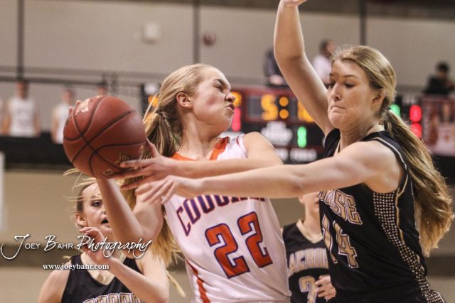 LaCrosse Lady Leopard #14 Olivia Baus tries to block a shot by Otis-Bison Lady Cougar #22 Maddie Wiltse. The Otis-Bison Lady Cougars defeated the LaCrosse Lady Leopards 61 to 55 in the Girls Semi-Final of the 2017 Hoisington Winter Jam at Hoisington Activity Center in Hoisington, Kansas on January 20, 2017. (Photo: Joey Bahr, www.joeybahr.com)undefined