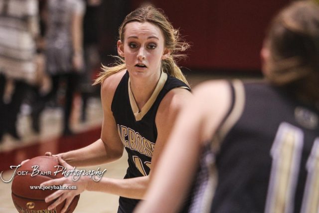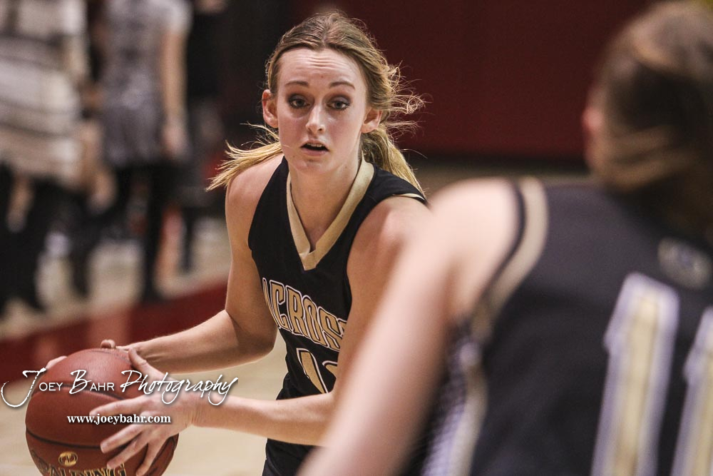 LaCrosse Lady Leopard #12 Bailey Baalmann looks for a teammate to passes the ball to. The Otis-Bison Lady Cougars defeated the LaCrosse Lady Leopards 61 to 55 in the Girls Semi-Final of the 2017 Hoisington Winter Jam at Hoisington Activity Center in Hoisington, Kansas on January 20, 2017. (Photo: Joey Bahr, www.joeybahr.com)undefined