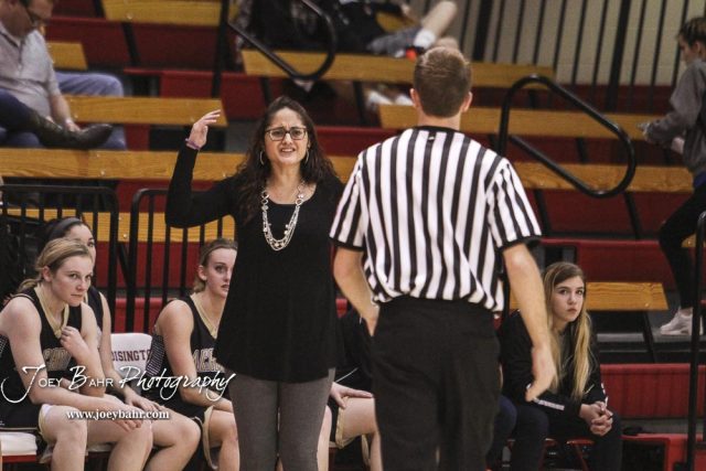 LaCrosse Lady Leopard Head Coach Nicholl Weigel disputes a call made by the official. The Otis-Bison Lady Cougars defeated the LaCrosse Lady Leopards 61 to 55 in the Girls Semi-Final of the 2017 Hoisington Winter Jam at Hoisington Activity Center in Hoisington, Kansas on January 20, 2017. (Photo: Joey Bahr, www.joeybahr.com)undefined