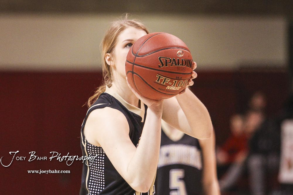 LaCrosse Lady Leopard #14 Olivia Baus shoots a free throw attempt. The Otis-Bison Lady Cougars defeated the LaCrosse Lady Leopards 61 to 55 in the Girls Semi-Final of the 2017 Hoisington Winter Jam at Hoisington Activity Center in Hoisington, Kansas on January 20, 2017. (Photo: Joey Bahr, www.joeybahr.com)undefined