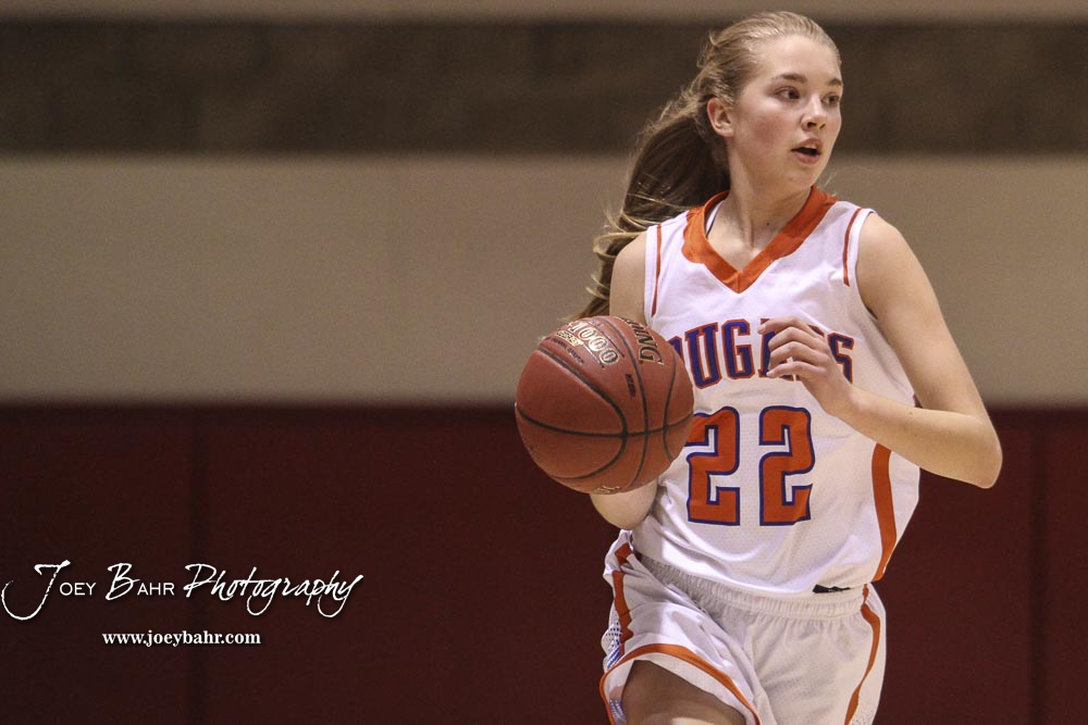 Otis-Bison Lady Cougar #22 Maddie Wiltse brings the ball down the court. The Otis-Bison Lady Cougars defeated the LaCrosse Lady Leopards 61 to 55 in the Girls Semi-Final of the 2017 Hoisington Winter Jam at Hoisington Activity Center in Hoisington, Kansas on January 20, 2017. (Photo: Joey Bahr, www.joeybahr.com)undefined