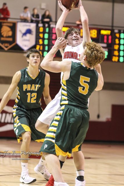 Hoisington Cardinal #5 Ryan Woydziak shoots over Pratt Greenback #5 Travis Theis. The Hoisington Cardinals defeated the Pratt Greenbacks by a score of 47 to 41 in the Boys Championship game of the 2018 Hoisington Winter Jam at the Hoisington Activity Center in Hoisington, Kansas on January 20, 2018. (Photo: Joey Bahr, www.joeybahr.com)undefined