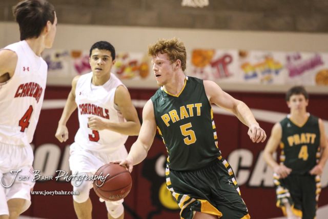 Pratt Greenback #5 Travis Theis dribbles with the ball. The Hoisington Cardinals defeated the Pratt Greenbacks by a score of 47 to 41 in the Boys Championship game of the 2018 Hoisington Winter Jam at the Hoisington Activity Center in Hoisington, Kansas on January 20, 2018. (Photo: Joey Bahr, www.joeybahr.com)undefined