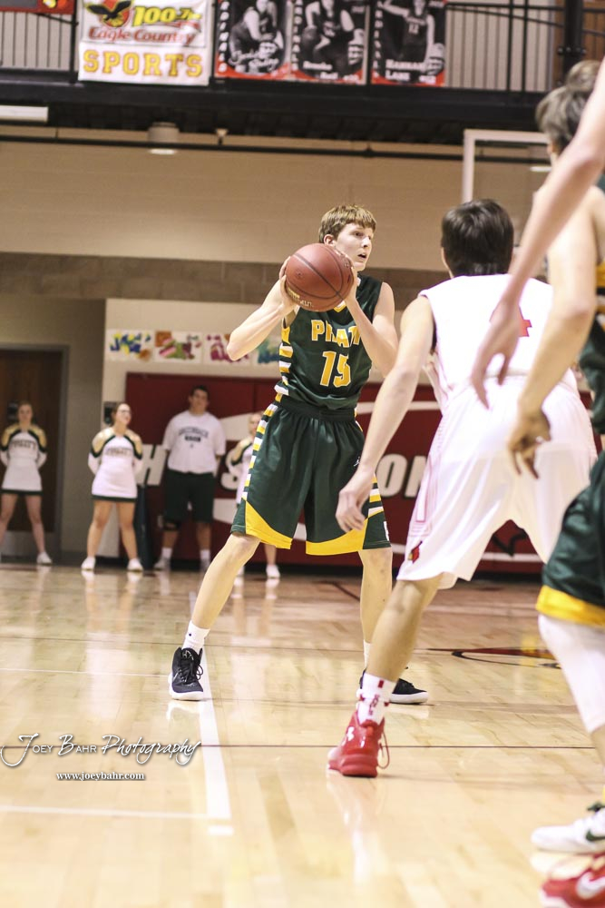 Pratt Greenback #15 Nathan Kolm looks for a teammate to pass the ball to. The Hoisington Cardinals defeated the Pratt Greenbacks by a score of 47 to 41 in the Boys Championship game of the 2018 Hoisington Winter Jam at the Hoisington Activity Center in Hoisington, Kansas on January 20, 2018. (Photo: Joey Bahr, www.joeybahr.com)undefined