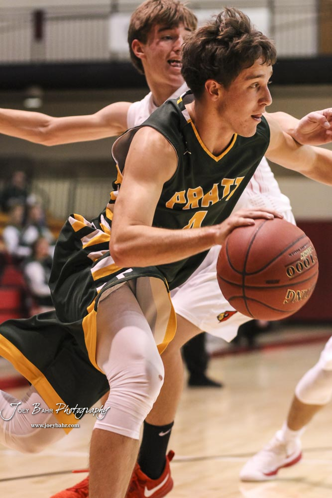 Pratt Greenback #4 Landen Studer drives along the baseline with the ball. The Hoisington Cardinals defeated the Pratt Greenbacks by a score of 47 to 41 in the Boys Championship game of the 2018 Hoisington Winter Jam at the Hoisington Activity Center in Hoisington, Kansas on January 20, 2018. (Photo: Joey Bahr, www.joeybahr.com)undefined
