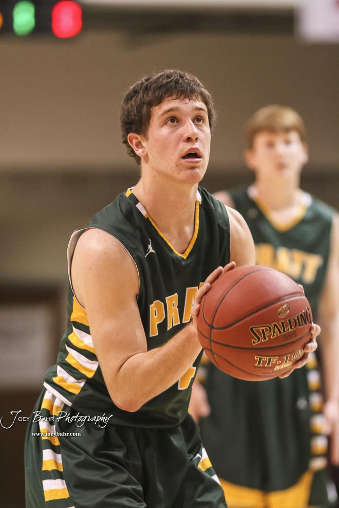 Pratt Greenback #4 Landen Studer shoots a free throw attempt. The Hoisington Cardinals defeated the Pratt Greenbacks by a score of 47 to 41 in the Boys Championship game of the 2018 Hoisington Winter Jam at the Hoisington Activity Center in Hoisington, Kansas on January 20, 2018. (Photo: Joey Bahr, www.joeybahr.com)undefined