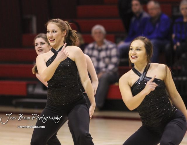 Members of the Hoisington Crimson Girls dance line perform during halftime. The Hoisington Cardinals defeated the Pratt Greenbacks by a score of 47 to 41 in the Boys Championship game of the 2018 Hoisington Winter Jam at the Hoisington Activity Center in Hoisington, Kansas on January 20, 2018. (Photo: Joey Bahr, www.joeybahr.com)undefined