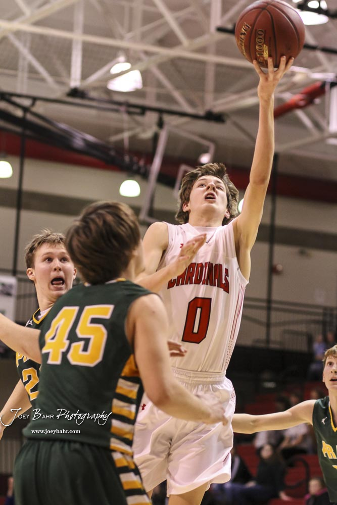 Hoisington Cardinal #0 Drew Nicholson goes for a layup over Pratt Greenback #45 Grant Bolen. The Hoisington Cardinals defeated the Pratt Greenbacks by a score of 47 to 41 in the Boys Championship game of the 2018 Hoisington Winter Jam at the Hoisington Activity Center in Hoisington, Kansas on January 20, 2018. (Photo: Joey Bahr, www.joeybahr.com)undefined