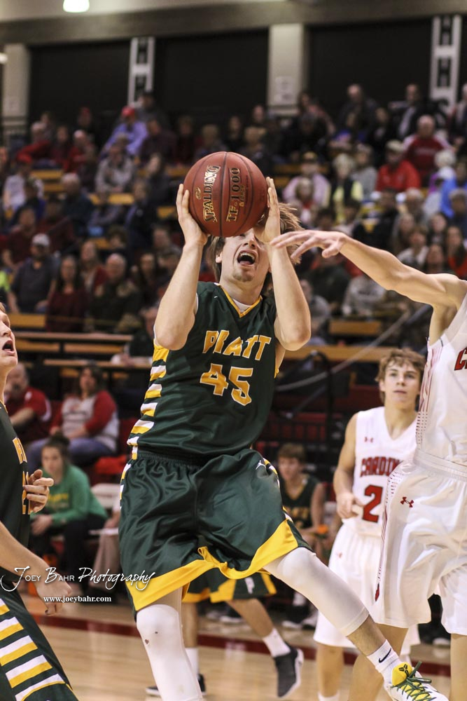 Pratt Greenback #45 Grant Bolen shoots from inside the lane. The Hoisington Cardinals defeated the Pratt Greenbacks by a score of 47 to 41 in the Boys Championship game of the 2018 Hoisington Winter Jam at the Hoisington Activity Center in Hoisington, Kansas on January 20, 2018. (Photo: Joey Bahr, www.joeybahr.com)undefined