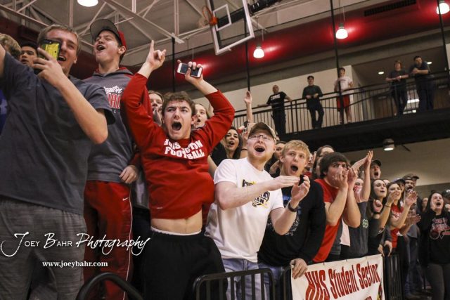 The Hoisington student section celebrates as victory looks certain in the game. The Hoisington Cardinals defeated the Pratt Greenbacks by a score of 47 to 41 in the Boys Championship game of the 2018 Hoisington Winter Jam at the Hoisington Activity Center in Hoisington, Kansas on January 20, 2018. (Photo: Joey Bahr, www.joeybahr.com)undefined