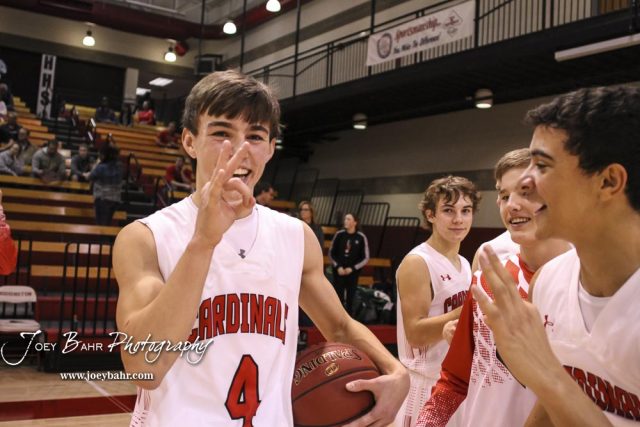 Hoisington Cardinal #4 Mason Haxton holds up three fingers to signify the team winning their third consecutive Hoisington Winter Jam Championship. The Hoisington Cardinals defeated the Pratt Greenbacks by a score of 47 to 41 in the Boys Championship game of the 2018 Hoisington Winter Jam at the Hoisington Activity Center in Hoisington, Kansas on January 20, 2018. (Photo: Joey Bahr, www.joeybahr.com)undefined