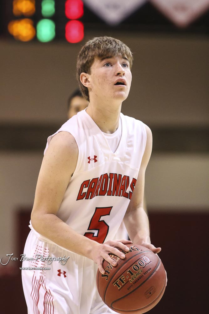 Hoisington Cardinal #5 Ryan Woydziak shoots a free throw attempt. The Hoisington Cardinals defeated the Pratt Greenbacks by a score of 47 to 41 in the Boys Championship game of the 2018 Hoisington Winter Jam at the Hoisington Activity Center in Hoisington, Kansas on January 20, 2018. (Photo: Joey Bahr, www.joeybahr.com)undefined