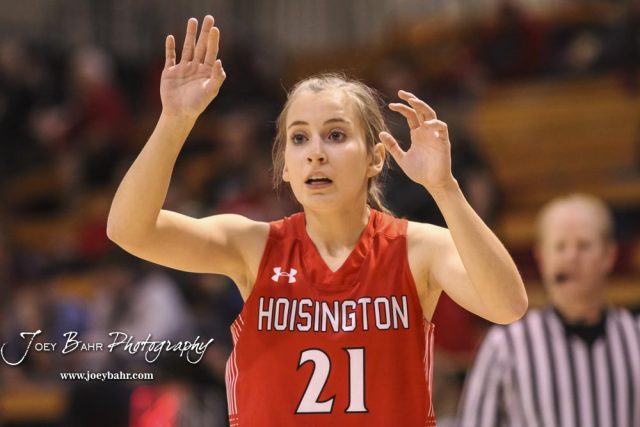 Hoisington Lady Cardinal #21 Suzanna Schneider calls out for the ball. The Hoisington Lady Cardinals defeated the Ellinwood Lady Eagles by a score of 46 to 19 in the Consolation Semi-Final of the 2018 Hoisington Winter Jam at the Hoisington Activity Center in Hoisington, Kansas on January 18, 2018. (Photo: Joey Bahr, www.joeybahr.com)undefined