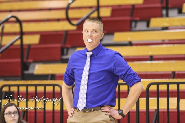 Ellinwood Lady Eagle Head Coach Andrew Cherry pops a bubble from his gum while watching a play develop. The Hoisington Lady Cardinals defeated the Ellinwood Lady Eagles by a score of 46 to 19 in the Consolation Semi-Final of the 2018 Hoisington Winter Jam at the Hoisington Activity Center in Hoisington, Kansas on January 18, 2018. (Photo: Joey Bahr, www.joeybahr.com)undefined