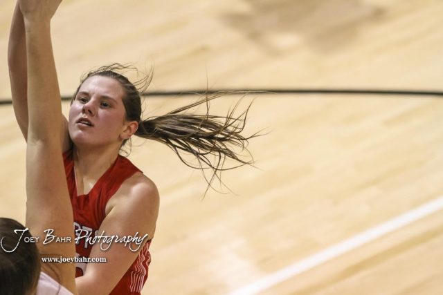 Hoisington Lady Cardinal #25 Maleigha Schmidt shoots a layup. The Hoisington Lady Cardinals defeated the Ellinwood Lady Eagles by a score of 46 to 19 in the Consolation Semi-Final of the 2018 Hoisington Winter Jam at the Hoisington Activity Center in Hoisington, Kansas on January 18, 2018. (Photo: Joey Bahr, www.joeybahr.com)undefined