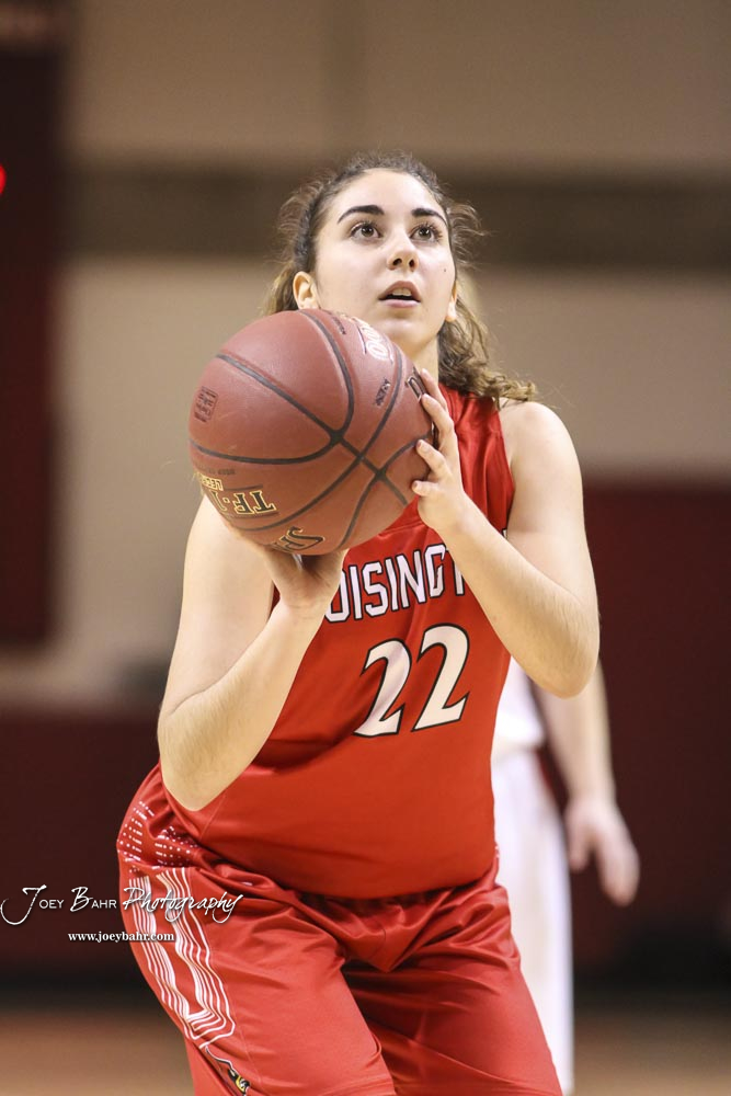 Hoisington Lady Cardinal #22 Iris Suarez shoots a free throw attempt. The Hoisington Lady Cardinals defeated the Ellinwood Lady Eagles by a score of 46 to 19 in the Consolation Semi-Final of the 2018 Hoisington Winter Jam at the Hoisington Activity Center in Hoisington, Kansas on January 18, 2018. (Photo: Joey Bahr, www.joeybahr.com)undefined