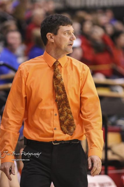 Otis-Bison Lady Cougar Head Coach Robert Trapp watches a play develop. The Russell Lady Broncos defeated the Otis-Bison Lady Cougars by a score of 54 to 34 in the Girls Championship game of the 2018 Hoisington Winter Jam at the Hoisington Activity Center in Hoisington, Kansas on January 20, 2018. (Photo: Joey Bahr, www.joeybahr.com)undefined