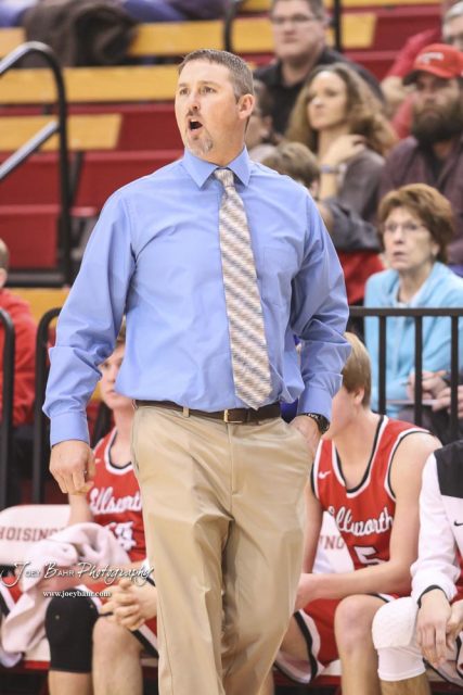 Ellsworth Bearcat Head Coach Ryan Webber calls out to his players. The Ellsworth Bearcats defeated the Otis-Bison Cougars by a score of 58 to 37 in the Third Place game of the 2018 Hoisington Winter Jam at the Hoisington Activity Center in Hoisington, Kansas on January 20, 2018. (Photo: Joey Bahr, www.joeybahr.com)undefined