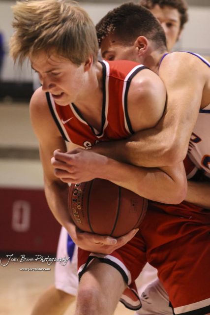 Otis-Bison Cougar #23 Maitland Wiltse tries to pull the ball away from Ellsworth Bearcat #2 Remington Cravens. The Ellsworth Bearcats defeated the Otis-Bison Cougars by a score of 58 to 37 in the Third Place game of the 2018 Hoisington Winter Jam at the Hoisington Activity Center in Hoisington, Kansas on January 20, 2018. (Photo: Joey Bahr, www.joeybahr.com)undefined