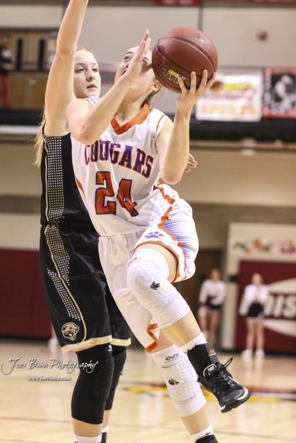 Otis-Bison Lady Cougar #24 Cristen Trapp goes for a layup as LaCrosse Lady Leopard #25 Addie Kershner defends. The Otis-Bison Lady Cougars defeated the LaCrosse Lady Leopards by a score of 29 to 23 in the Semi-Final of the 2018 Hoisington Winter Jam at the Hoisington Activity Center in Hoisington, Kansas on January 19, 2018. (Photo: Joey Bahr, www.joeybahr.com)undefined