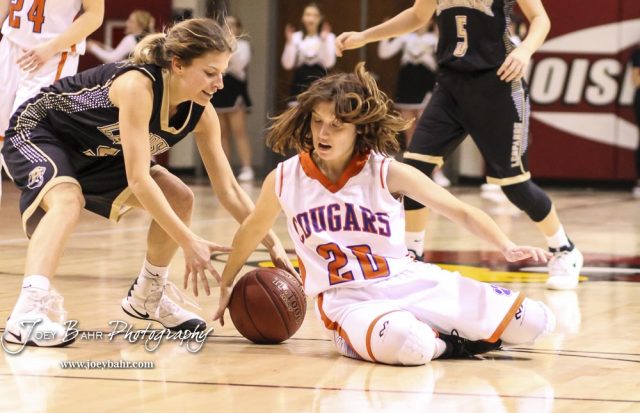 Otis-Bison Lady Cougar #20 Sheridan Ewy tries to control the ball as LaCrosse Lady Leopard #3 Lexi Anderson reaches for it. The Otis-Bison Lady Cougars defeated the LaCrosse Lady Leopards by a score of 29 to 23 in the Semi-Final of the 2018 Hoisington Winter Jam at the Hoisington Activity Center in Hoisington, Kansas on January 19, 2018. (Photo: Joey Bahr, www.joeybahr.com)undefined