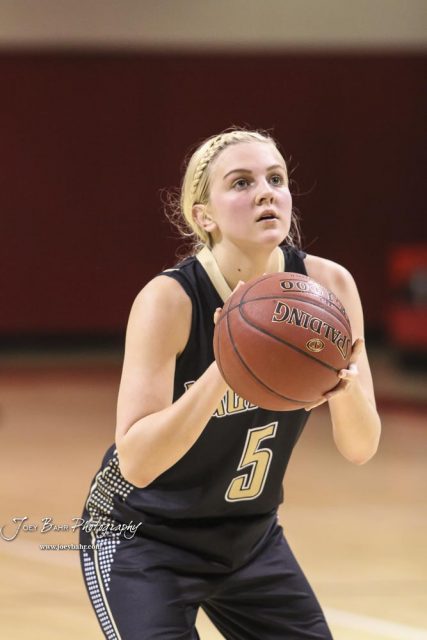 LaCrosse Lady Leopard #5 Abbey Oborny shoots a free throw attempt. The Otis-Bison Lady Cougars defeated the LaCrosse Lady Leopards by a score of 29 to 23 in the Semi-Final of the 2018 Hoisington Winter Jam at the Hoisington Activity Center in Hoisington, Kansas on January 19, 2018. (Photo: Joey Bahr, www.joeybahr.com)undefined