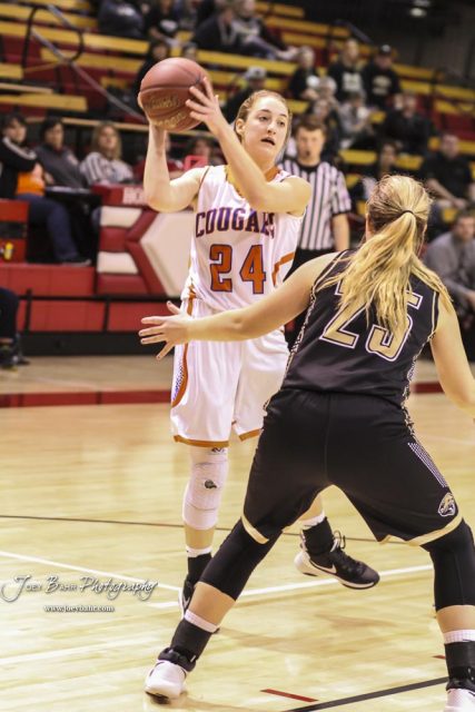 Otis-Bison Lady Cougar #24 Cristen Trapp looks to pass the ball to a teammate as LaCrosse Lady Leopard #25 Addie Kershner defends. The Otis-Bison Lady Cougars defeated the LaCrosse Lady Leopards by a score of 29 to 23 in the Semi-Final of the 2018 Hoisington Winter Jam at the Hoisington Activity Center in Hoisington, Kansas on January 19, 2018. (Photo: Joey Bahr, www.joeybahr.com)undefined