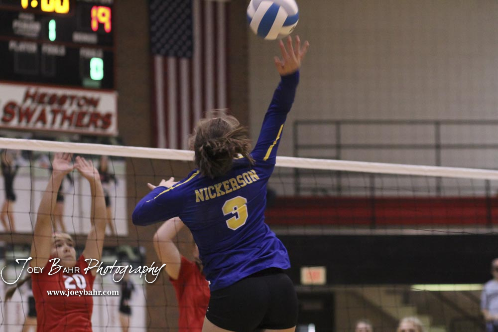 Nickerson Lady Panther #3 Cyra Kelley goes for a kill against Hesston in pool play. The teams of the Central Kansas League gathered for the League Preseason Volleyball Tournament held at Hesston High School in Hesston, Kansas on August 31, 2019. (Photo: Joey Bahr, www.joeybahr.com)