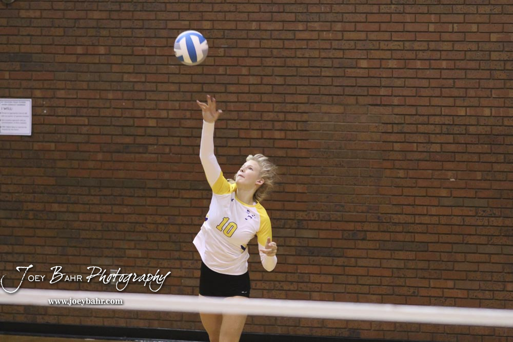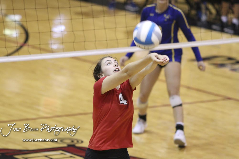 Hillsboro Lady Trojan #4 Jessica Saunders hits the ball over the net during the semifinal against Nickerson. The teams of the Central Kansas League gathered for the League Preseason Volleyball Tournament held at Hesston High School in Hesston, Kansas on August 31, 2019. (Photo: Joey Bahr, www.joeybahr.com)