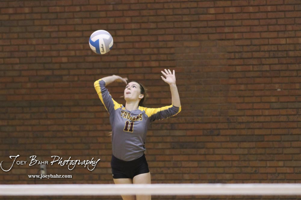 Hillsboro Lady Trojan #11 Kinsey Kleiner serves the ball during the semifinal versus Nickerson. The teams of the Central Kansas League gathered for the League Preseason Volleyball Tournament held at Hesston High School in Hesston, Kansas on August 31, 2019. (Photo: Joey Bahr, www.joeybahr.com)