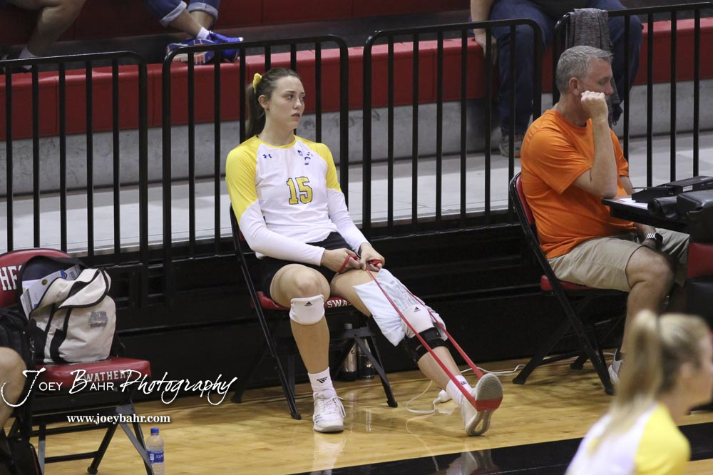 Nickerson Lady Panther #15 Morgan Stout stretches her knee while she waits for the rotation to get around to her in the semifinal versus Hillsboro. The teams of the Central Kansas League gathered for the League Preseason Volleyball Tournament held at Hesston High School in Hesston, Kansas on August 31, 2019. (Photo: Joey Bahr, www.joeybahr.com)