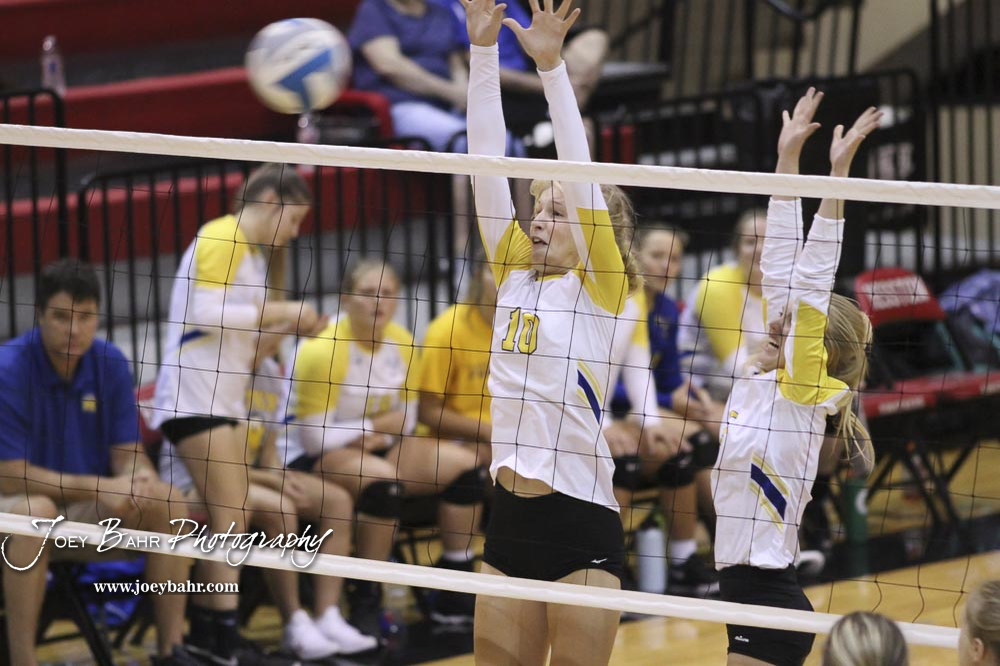 Hillsboro Lady Trojan #27 Tuesday Weisbeck tries to hit the ball over the wall of Nickerson Lady Panther #15 Morgan Stout during the semifinals. The teams of the Central Kansas League gathered for the League Preseason Volleyball Tournament held at Hesston High School in Hesston, Kansas on August 31, 2019. (Photo: Joey Bahr, www.joeybahr.com)