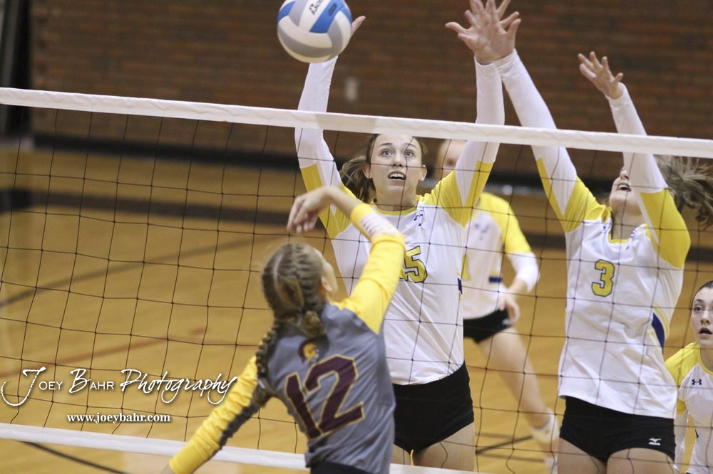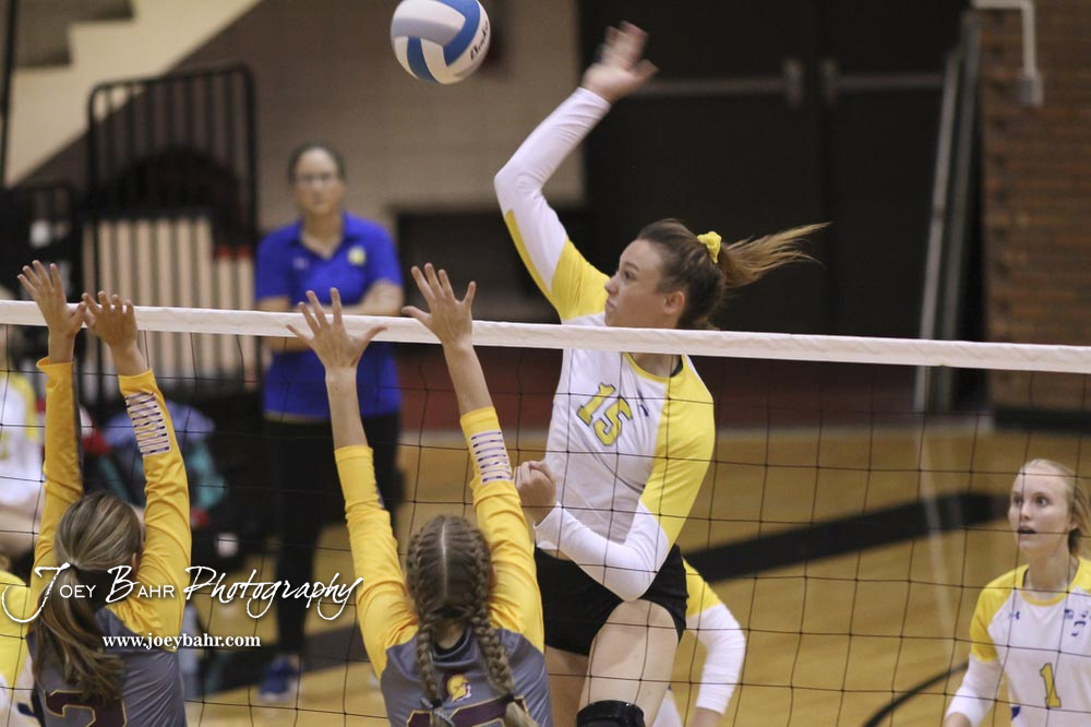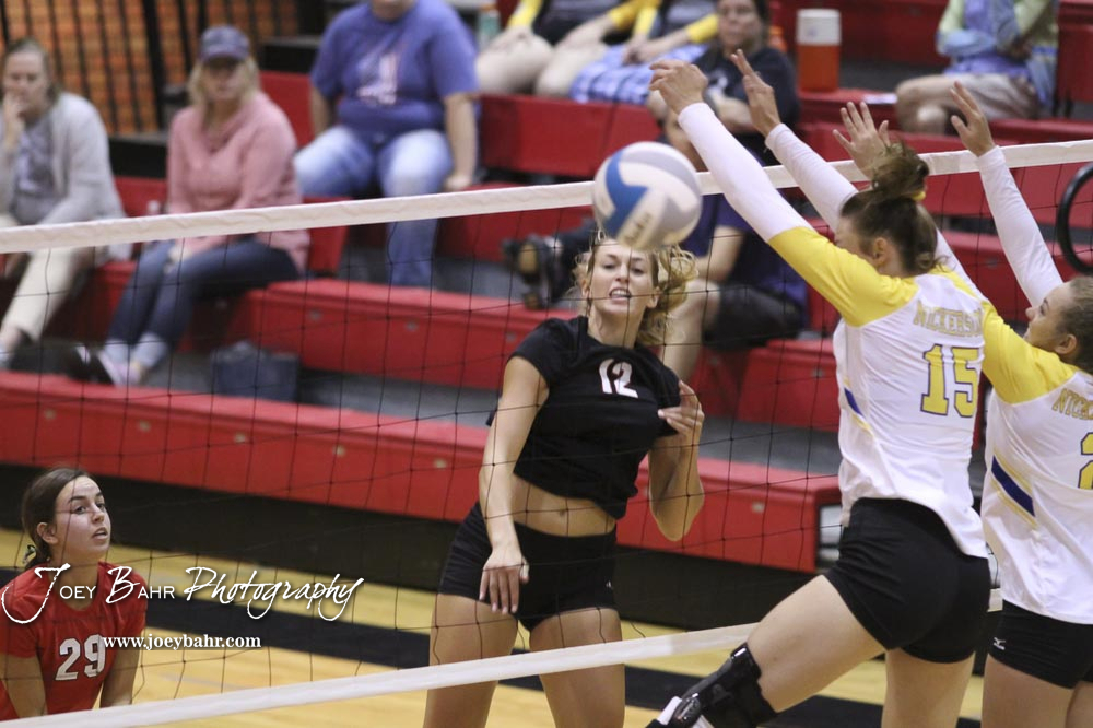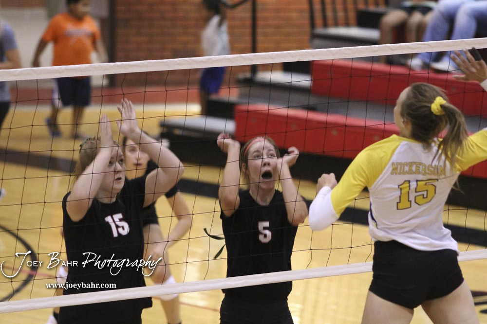 Hesston Lady Swathers #15 Lindsey Deegan and #5 Elise Kaiser prepare to block a shot by Nickerson Lady Panther #15 Morgan Stout in the championship match. The teams of the Central Kansas League gathered for the League Preseason Volleyball Tournament held at Hesston High School in Hesston, Kansas on August 31, 2019. (Photo: Joey Bahr, www.joeybahr.com)