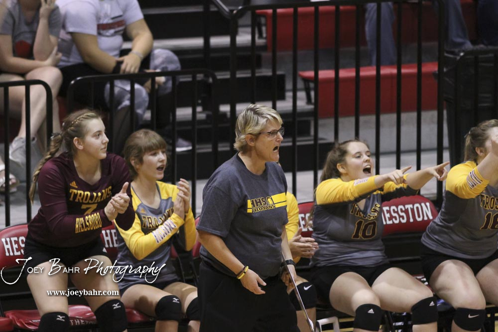 Hillsboro Lady Trojan Head Coach Sandy Arnold celebrates winning a point in the semifinal against Nickerson. The teams of the Central Kansas League gathered for the League Preseason Volleyball Tournament held at Hesston High School in Hesston, Kansas on August 31, 2019. (Photo: Joey Bahr, www.joeybahr.com)