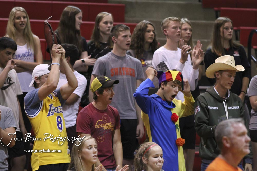 Hesston students cheer on their team in the finals of the tournament. The teams of the Central Kansas League gathered for the League Preseason Volleyball Tournament held at Hesston High School in Hesston, Kansas on August 31, 2019. (Photo: Joey Bahr, www.joeybahr.com)