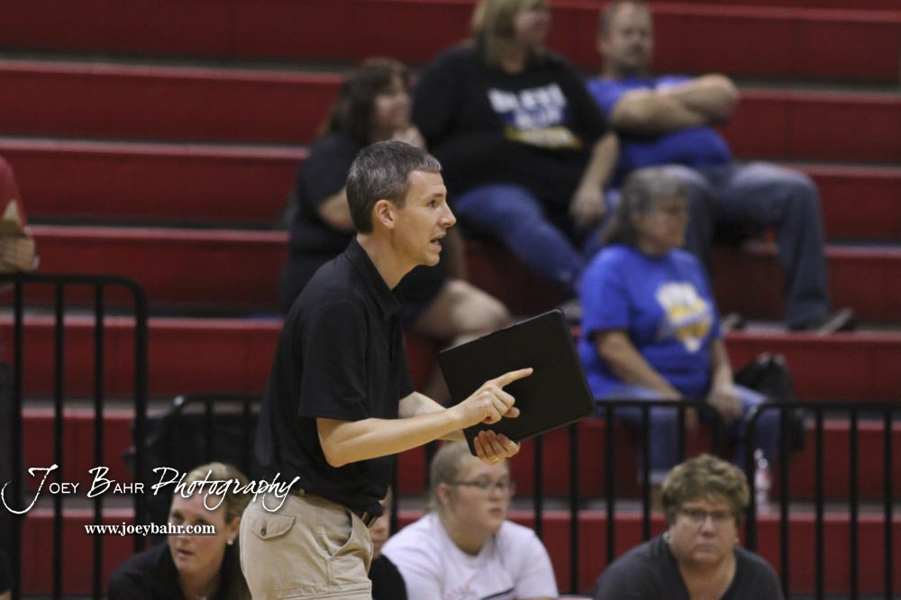 Hesston Lady Swather Head Coach Jason Peters sends in the play for the serve in the finals match versus Nickerson. The teams of the Central Kansas League gathered for the League Preseason Volleyball Tournament held at Hesston High School in Hesston, Kansas on August 31, 2019. (Photo: Joey Bahr, www.joeybahr.com)