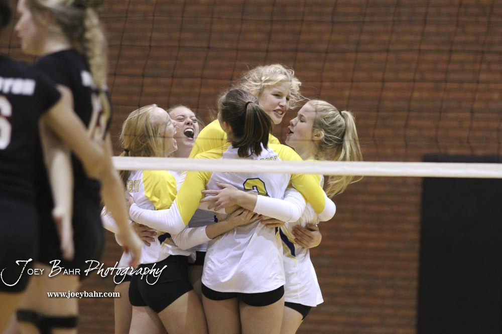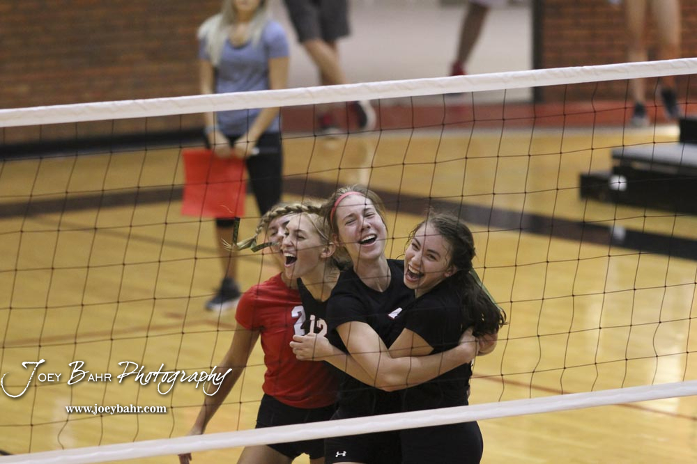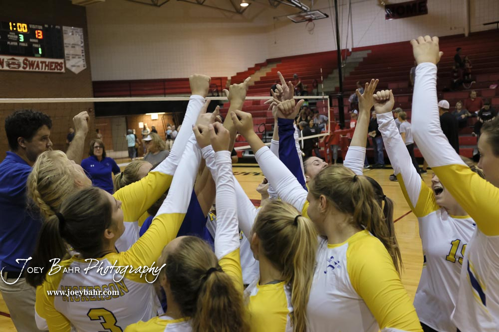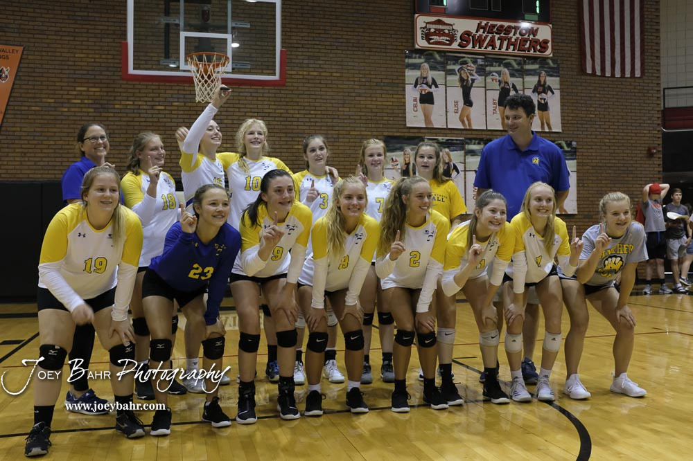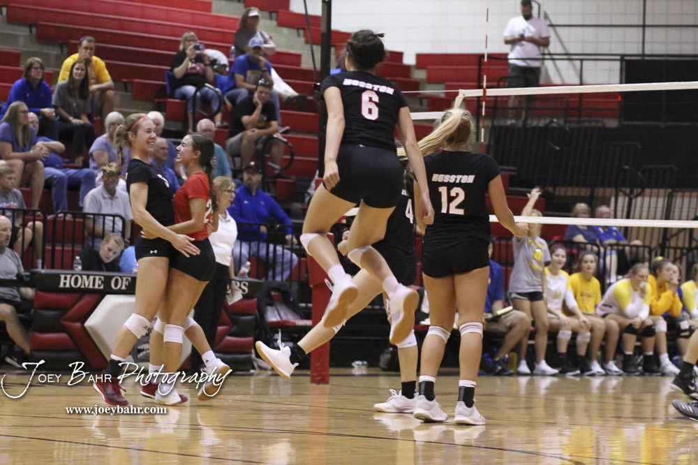 Hesston players celebrate winning the second game of the championship match against Nickerson. The teams of the Central Kansas League gathered for the League Preseason Volleyball Tournament held at Hesston High School in Hesston, Kansas on August 31, 2019. (Photo: Joey Bahr, www.joeybahr.com)