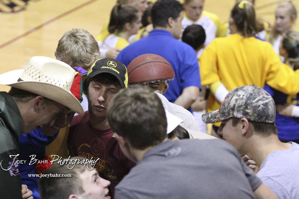 Hesston students huddle up as the teams huddle between the first and second games of the championship match. The teams of the Central Kansas League gathered for the League Preseason Volleyball Tournament held at Hesston High School in Hesston, Kansas on August 31, 2019. (Photo: Joey Bahr, www.joeybahr.com)