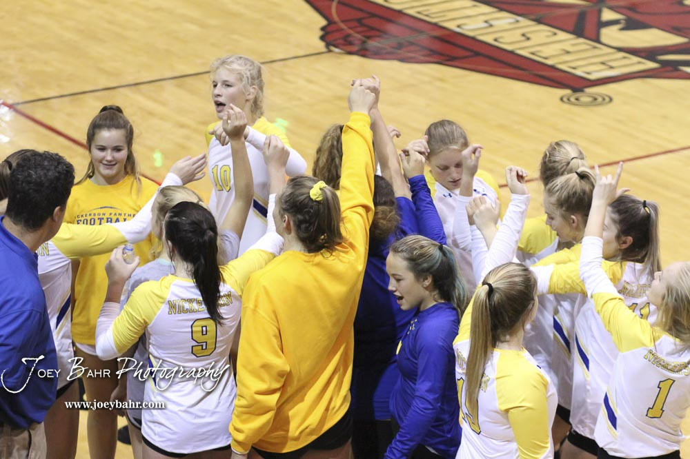 The Nickerson Lady Panthers enjoy a team breakdown in celebration for winning the CKL Preseason Tournament championship. The teams of the Central Kansas League gathered for the League Preseason Volleyball Tournament held at Hesston High School in Hesston, Kansas on August 31, 2019. (Photo: Joey Bahr, www.joeybahr.com)