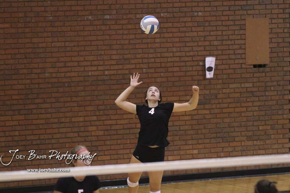 Hesston Lady Swather #4 Harley Ferralez serves the ball against Nickerson in the championship match. The teams of the Central Kansas League gathered for the League Preseason Volleyball Tournament held at Hesston High School in Hesston, Kansas on August 31, 2019. (Photo: Joey Bahr, www.joeybahr.com)