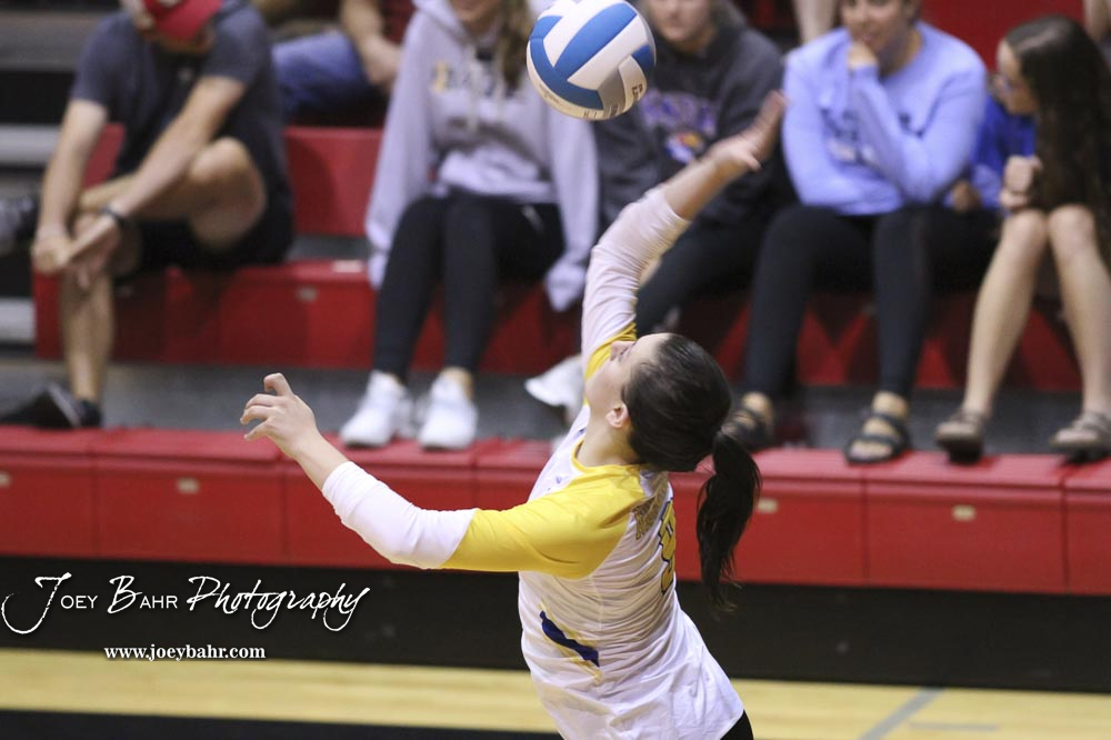 Hesston Lady Swather #4 Harley Ferralez passes the ball against Nickerson in pool play. The teams of the Central Kansas League gathered for the League Preseason Volleyball Tournament held at Hesston High School in Hesston, Kansas on August 31, 2019. (Photo: Joey Bahr, www.joeybahr.com)