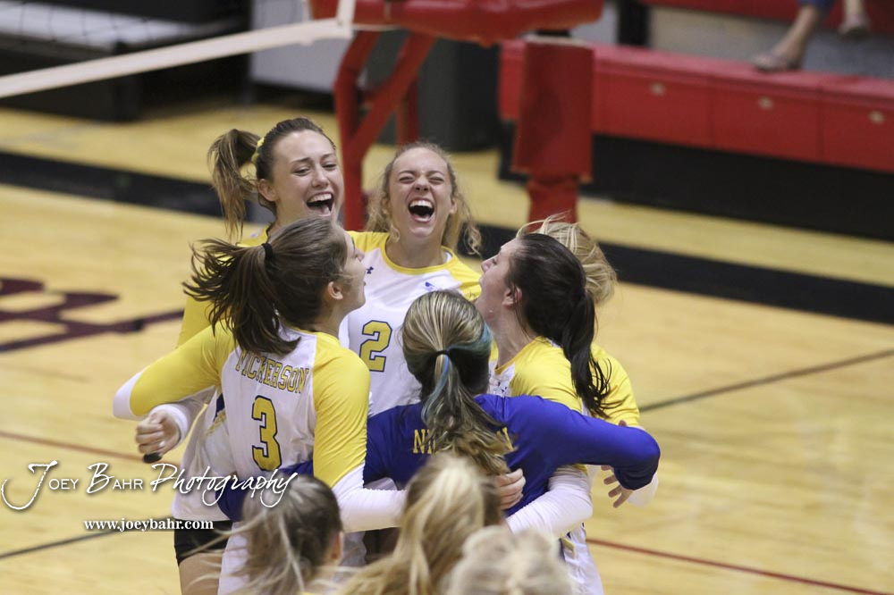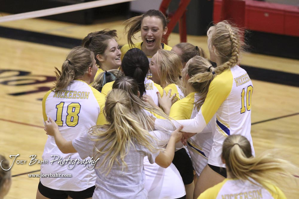 Nickerson celebrates winning the first match against Hesston in the championship match of the tournament. The teams of the Central Kansas League gathered for the League Preseason Volleyball Tournament held at Hesston High School in Hesston, Kansas on August 31, 2019. (Photo: Joey Bahr, www.joeybahr.com)
