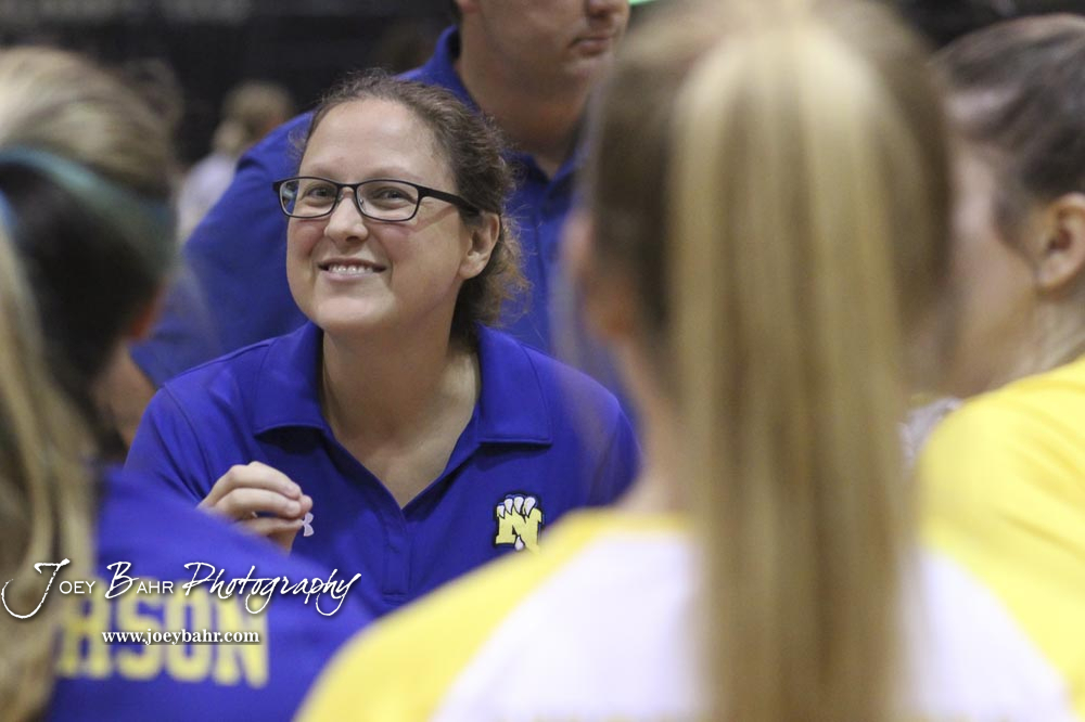 Nickerson Lady Panther Head Coach Deedra Emel smiles as she talks to her team after they won the CKL Preseason Tournament. The teams of the Central Kansas League gathered for the League Preseason Volleyball Tournament held at Hesston High School in Hesston, Kansas on August 31, 2019. (Photo: Joey Bahr, www.joeybahr.com)