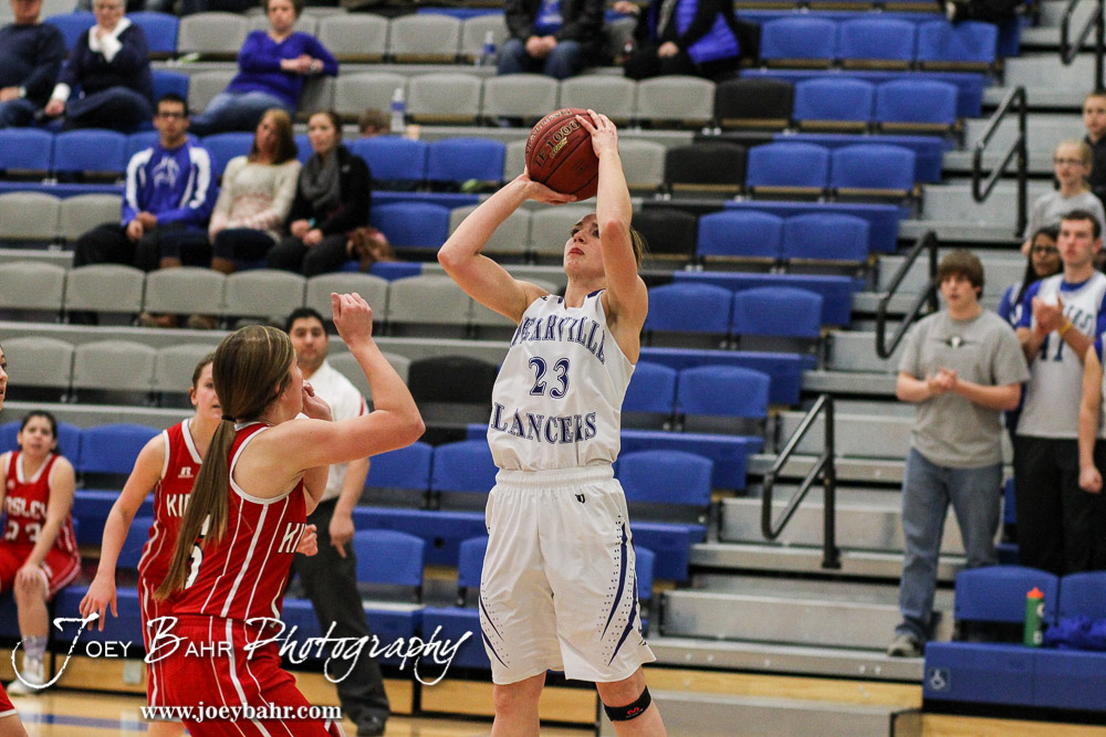 Spearville Lady Lancer Cody Offerle (#23) shoots the ball during the 2A Sub-State First Round Game with the Spearville Lady Lancers vs the Kinsley Lady Coyotes with Spearville winning 66 to 53 at Spearville High School in Spearville, Kansas on March 3, 2015. (Photo: Joey Bahr, www.joeybahr.com)