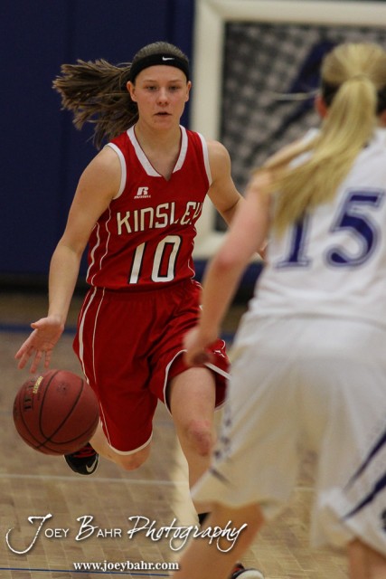 Kinsley Lady Coyote Paige Herrman (#10) drives down the court during the 2A Sub-State First Round Game with the Spearville Lady Lancers vs the Kinsley Lady Coyotes with Spearville winning 66 to 53 at Spearville High School in Spearville, Kansas on March 3, 2015. (Photo: Joey Bahr, www.joeybahr.com)