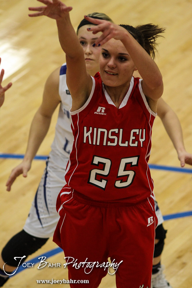 Kinsley Lady Coyote Kate Gleason (#25) shoots the ball during the 2A Sub-State First Round Game with the Spearville Lady Lancers vs the Kinsley Lady Coyotes with Spearville winning 66 to 53 at Spearville High School in Spearville, Kansas on March 3, 2015. (Photo: Joey Bahr, www.joeybahr.com)