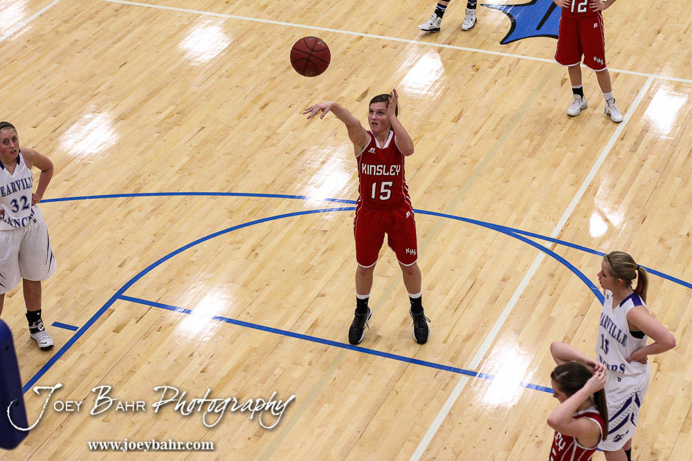 Kinsley Lady Coyote Scout Frame (#15) shoots a free throw during the 2A Sub-State First Round Game with the Spearville Lady Lancers vs the Kinsley Lady Coyotes with Spearville winning 66 to 53 at Spearville High School in Spearville, Kansas on March 3, 2015. (Photo: Joey Bahr, www.joeybahr.com)