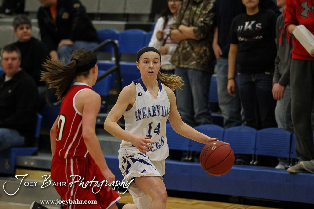 Spearville Lady Lancer Tausha Craft (#14) looks for a teammate to pass to during the 2A Sub-State First Round Game with the Spearville Lady Lancers vs the Kinsley Lady Coyotes with Spearville winning 66 to 53 at Spearville High School in Spearville, Kansas on March 3, 2015. (Photo: Joey Bahr, www.joeybahr.com)