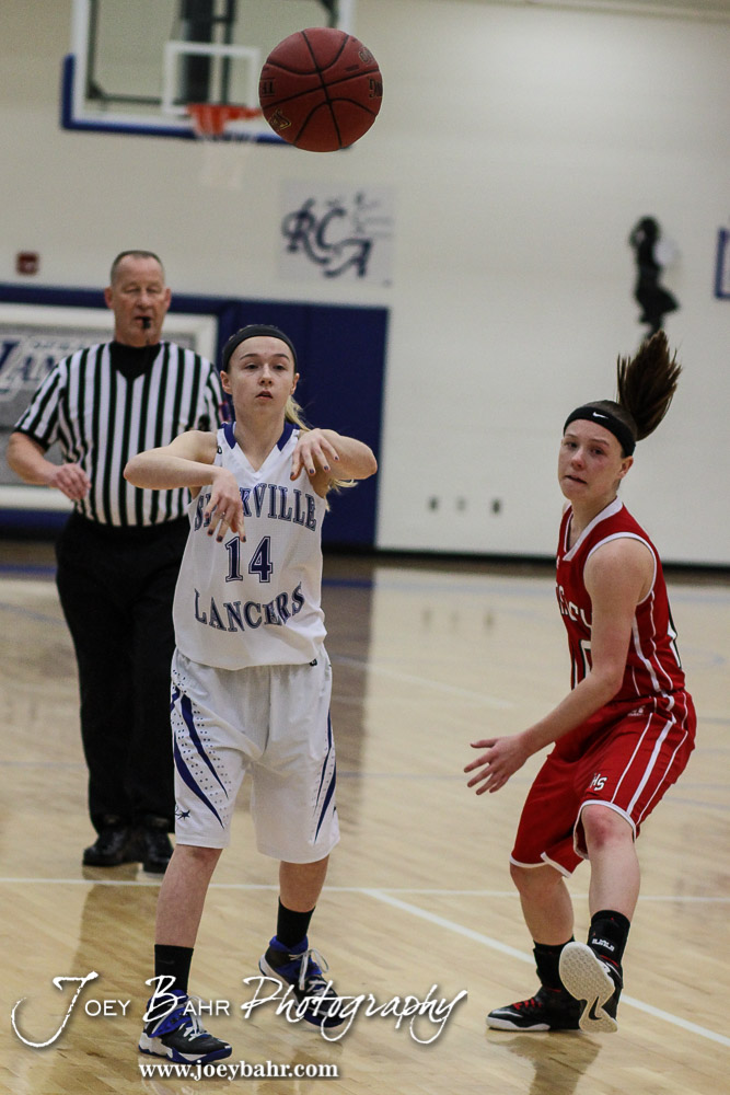 Spearville Lady Lancer Tausha Craft (#14) passes the ball to a teammate during the 2A Sub-State First Round Game with the Spearville Lady Lancers vs the Kinsley Lady Coyotes with Spearville winning 66 to 53 at Spearville High School in Spearville, Kansas on March 3, 2015. (Photo: Joey Bahr, www.joeybahr.com)