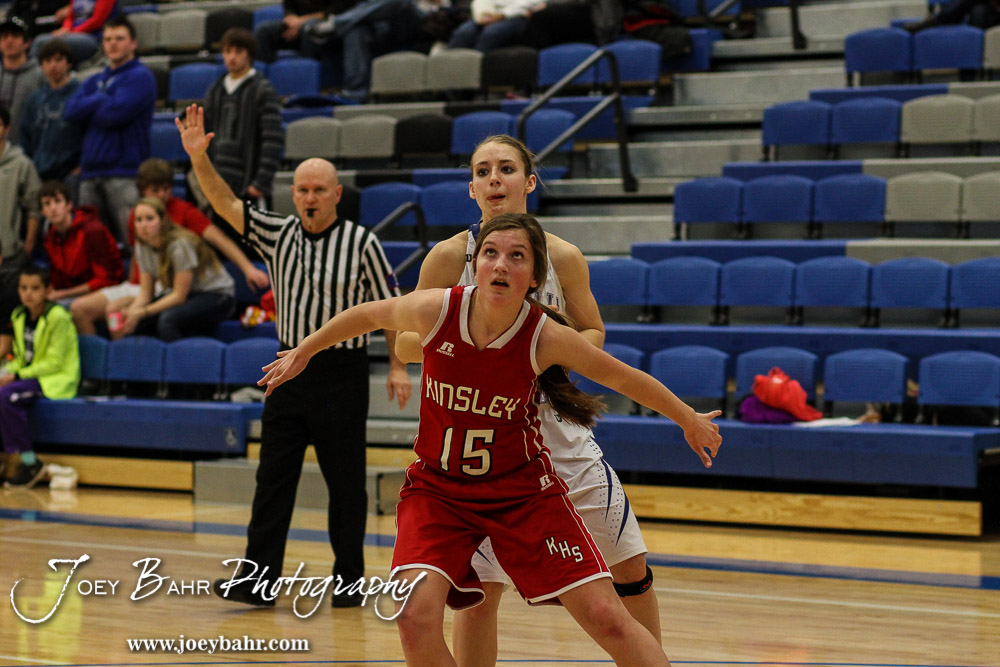 Kinsley Lady Coyote Scout Frame (#15) blocks out during a free throw attempt during the 2A Sub-State First Round Game with the Spearville Lady Lancers vs the Kinsley Lady Coyotes with Spearville winning 66 to 53 at Spearville High School in Spearville, Kansas on March 3, 2015. (Photo: Joey Bahr, www.joeybahr.com)
